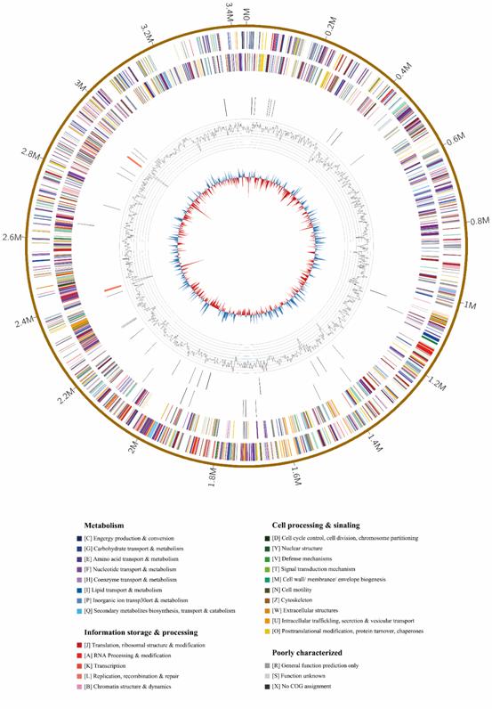 从基因组特征分析,赖心河壤霉菌基因组大小(3.4 Mb),G+C含量(69.0 mol%)以及COG注释结果比例构成方面也与该属其他成员基因组特征基本吻合,因此可以确定该种为Agromcyes新种的分类学地位,并且可以通过生化结果进行近缘株间与分离株间的鉴别。KEGG分析结果表明赖心河壤霉菌菌株HY052T含有完整的shikimatepathway (莽草酸途径代谢通路),这是细菌、古生菌、真菌、藻类、原生动植物生物合成叶酸和芳香族氨基酸(苯丙氨酸、酪氨酸和色氨酸)的基本组成部分,在动物基因组中没有发现过该通路的存在。有研究表明该通路含有aroA和aroB基因,这两个基因可以产生完整的黄毒素(toxoflavin)。虽然黄毒素不足以单独致病,但该毒素是重要的毒力因子。另外,还有研究证明,包含莽草酯途径的基因如果发生突变,将会大大降低微生物本身毒性。由此可知完整携带该通路基因组可能会增加菌株本身毒性。赖心河壤霉菌的发现有助于增加对微生物丰富性的认识,为进一步研究微生物致病性提供科学支撑。