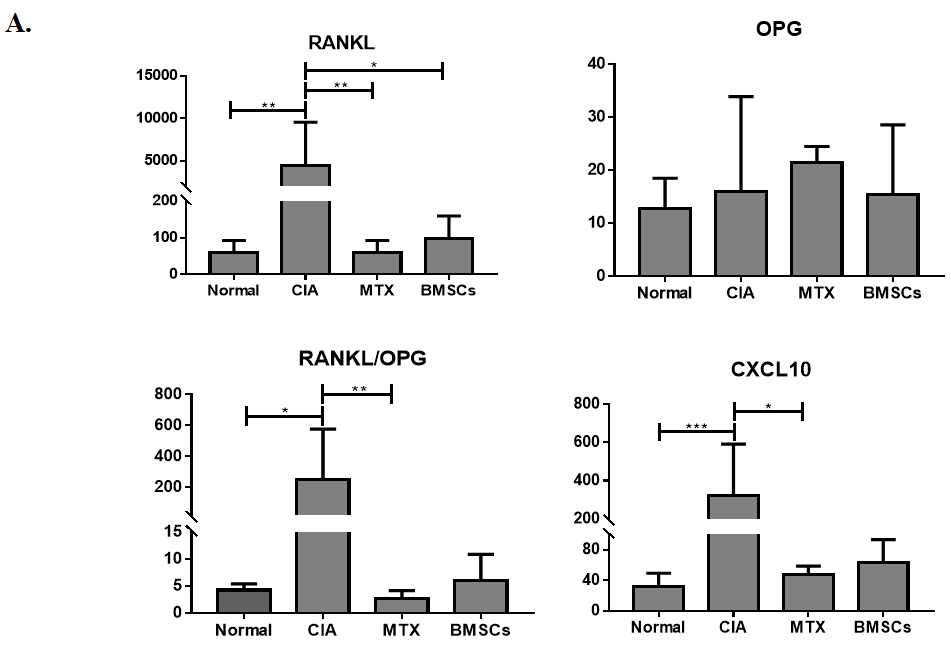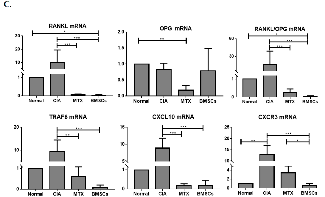 图3:BMSCs对CIA模型大鼠RANKL/OPG/TRAF6信号通路及CXCL10/CXCR3趋化因子轴的影响