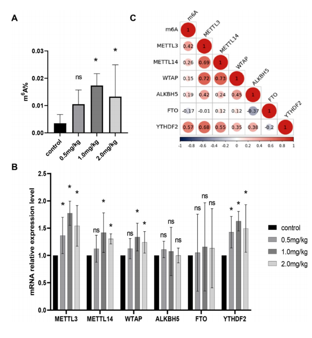 本研究采用皮下注射氯化镉(0.5、1.0、2.0 mg/kg)的 方法构建了大鼠肾损伤模型。测定 m 6A 总体水平和 m 6A 修饰酶(METTL3、METTL14、WTAP、ALKBH5、FTO)的相对表达水平, 结果显示 1.0 mg/kg 和 2.0mg/kg 处理组总 m 6A 水平显著高于 对照组,且与对照组相比,各暴露组的 METTL3、METTL14、WTAP 和 YTHDF2 均显著上调(P > 0.05),见图 2。