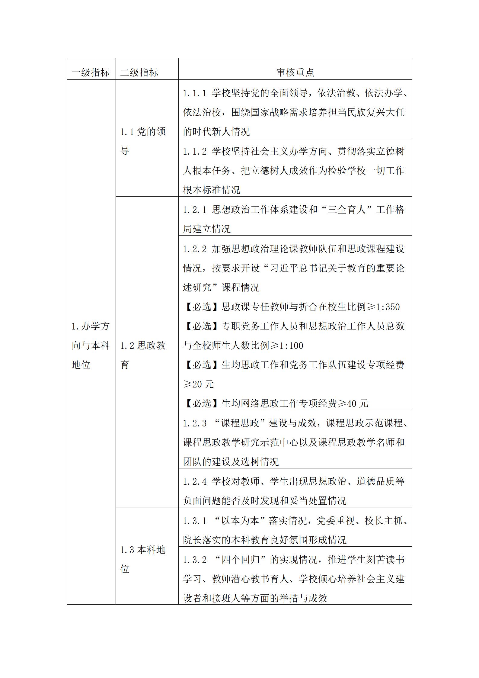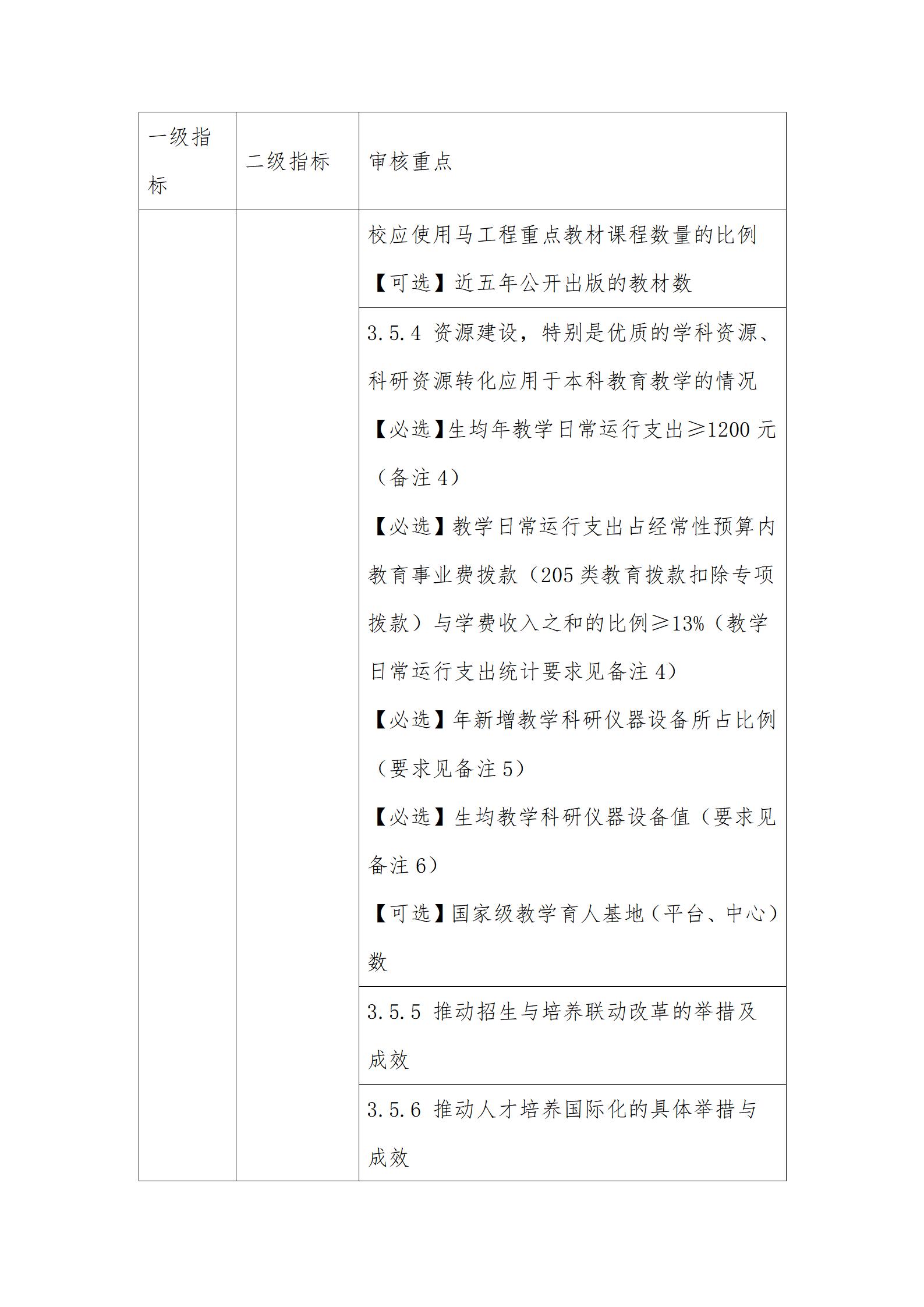 1.审核重点中定量指标的具体要求可参考国家相关标准。其中,【必选】是指该定量指标学校必须选择;【可选】是指该定量指标学校可结合办学实际和优势特色,从高等教育质量监测国家数据平台提供的教学基本状态常态监测数据中自主选择,进行等量或超量替换。